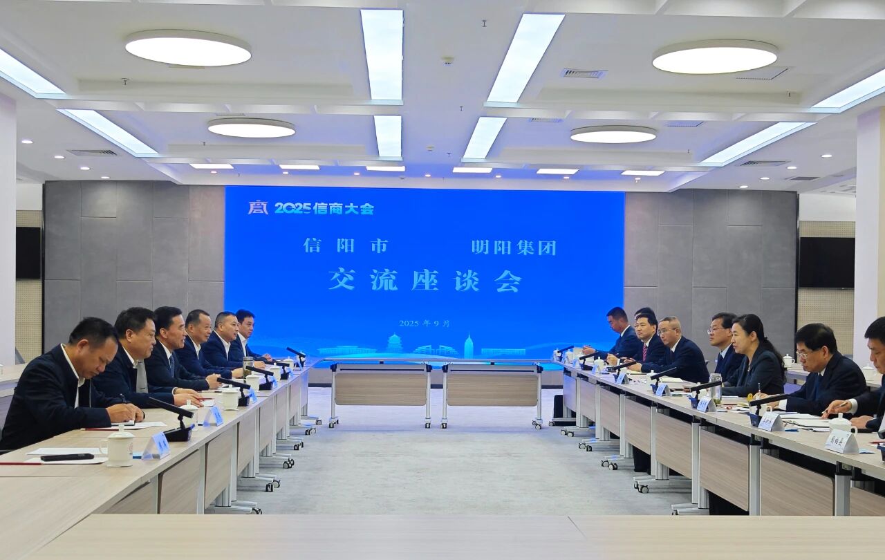 9月25日,信阳市市委书记张宏伟、信阳市市长陈志伟与明阳集团董事长张传卫座谈交流,表示坚定支持明阳扎根家乡做大做强,打造中部新能源产业高地。